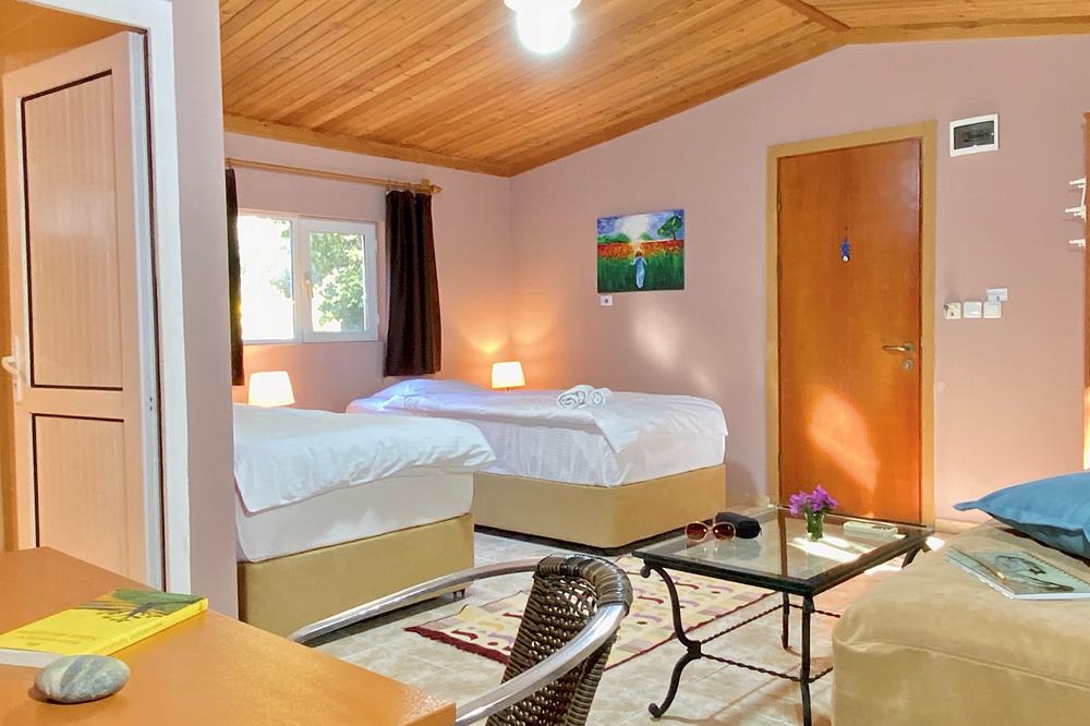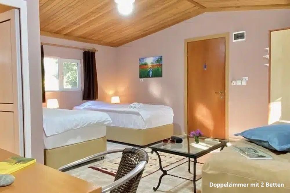 ◼ DZ Doppelzimmer: (30m²). Diese sehr schmuck eingerichteten Zimmer verfügen entweder über 2 Einzelbetten (je 100x210cm) oder ein grosses Doppelbett (160x210cm). Dazu kommen Sofa und Beistelltisch, Badezimmer mit Dusche/WC, Klimaanlage bzw. Heizung für die Übergangszeit, Vorhänge, Fliegengitter und eine kleine Privatterrasse. Die Einzelbetten stehen entweder nebeneinander oder in getrennten Ecken. So können die Zimmer auch für gemeinsam Reisende "Nicht-Paare" benutzt werden. Für die Zimmer mit Doppelbett haben Paare den Vorrang. Beide Zimmervarianten sind auch zur Alleinbenützung buchbar (siehe "EZ/DZA", unten).
