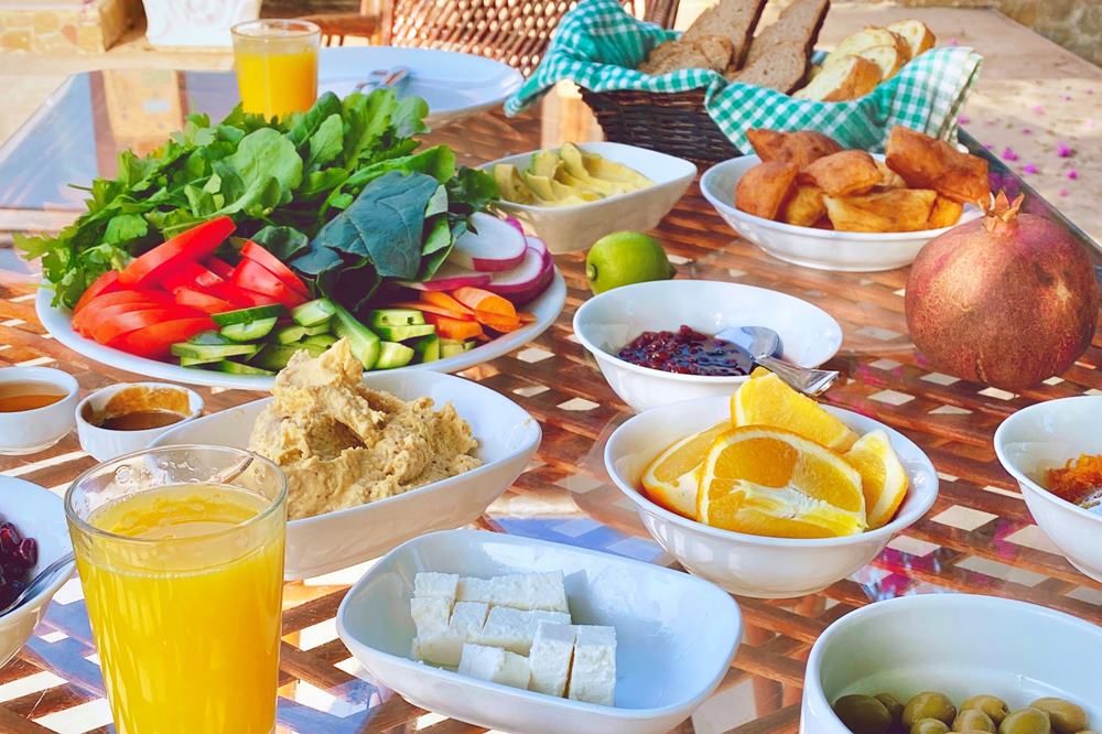 Die Küche hier ist einfach lecker! Zudem raffiniert, frisch, würzig, scharf, süss, orientalisch und überraschend. Es gibt eine abwechslungsreiche vegetarische Vollpension mit reichhaltigen Buffets am Morgen und am Abend und immer auch ein kleines Mittagessen. Vegane oder anti-allergene Mahlzeiten können auf Voranmeldung (Anfrage) nach Möglichkeit arrangiert werden. Ausnahmen siehe unten. Am Samstagabend werden auch Fleisch- oder Fischgerichte serviert. Das Highlight am Morgen: Ein Frühstücksbuffet mit Obstsalat, Müesli, Marmeladen, Joghurt, Käse, Eiern, Oliven, Gurken, Tomaten, selbstgebackenem Brot und Gebäck, Filterkaffee, frisch gepressten Säften... Und ausserdem nachmittags und abends Süssspeisen-Buffet sowie ganztags kostenlos Chaï-Tee, Quellwasser, Obst und Gebäck. Gegen separate Kasse: Kaffee, Bier, Wein zu ortsüblichen Preisen. ◼ Allergien: Laktosefreie Milch ist immer vorhanden, jedoch keine weiteren laktosefreien Ersatzstoffe. Auch glutenfrei kann arrangiert werden. Die lokale Buffet-Küche ist aber nicht geeignet für Leute mit schwerer Zöliakie bzw. Unverträglichkeit von Nüssen, Histamin, Fruktose, Zwiebeln, Knoblauch oder Tomaten. Im Zweifelsfall bitte anfragen.